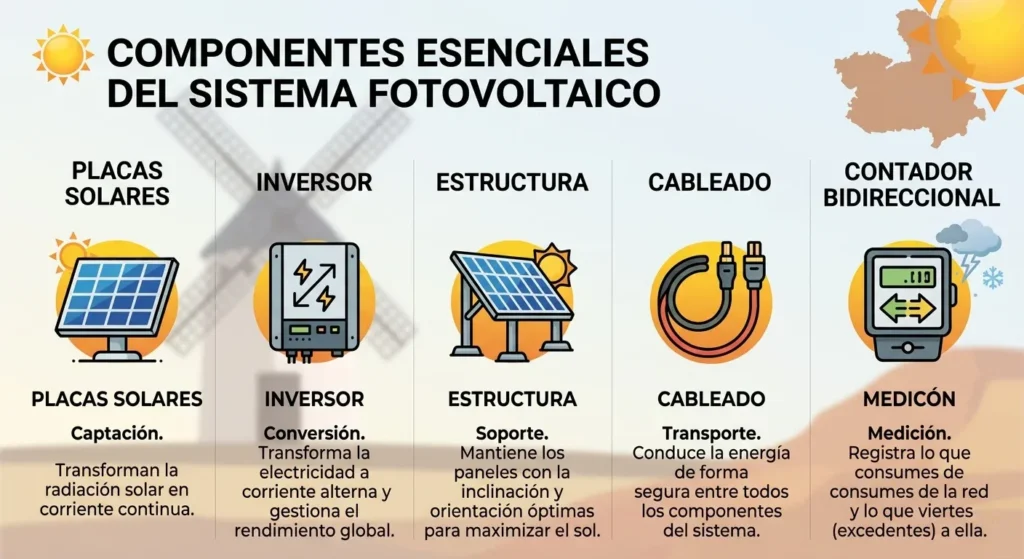 Entender el funcionamiento de las instalaciones fotovoltaicas en Ocaña es sumamente sencillo, ya que se trata de un proceso tecnológico totalmente automatizado. Gracias a la excelente radiación solar de la zona, el sistema comienza a trabajar de forma autónoma desde el amanecer, transformando el recurso natural más abundante de la meseta en energía útil para tu día a día.